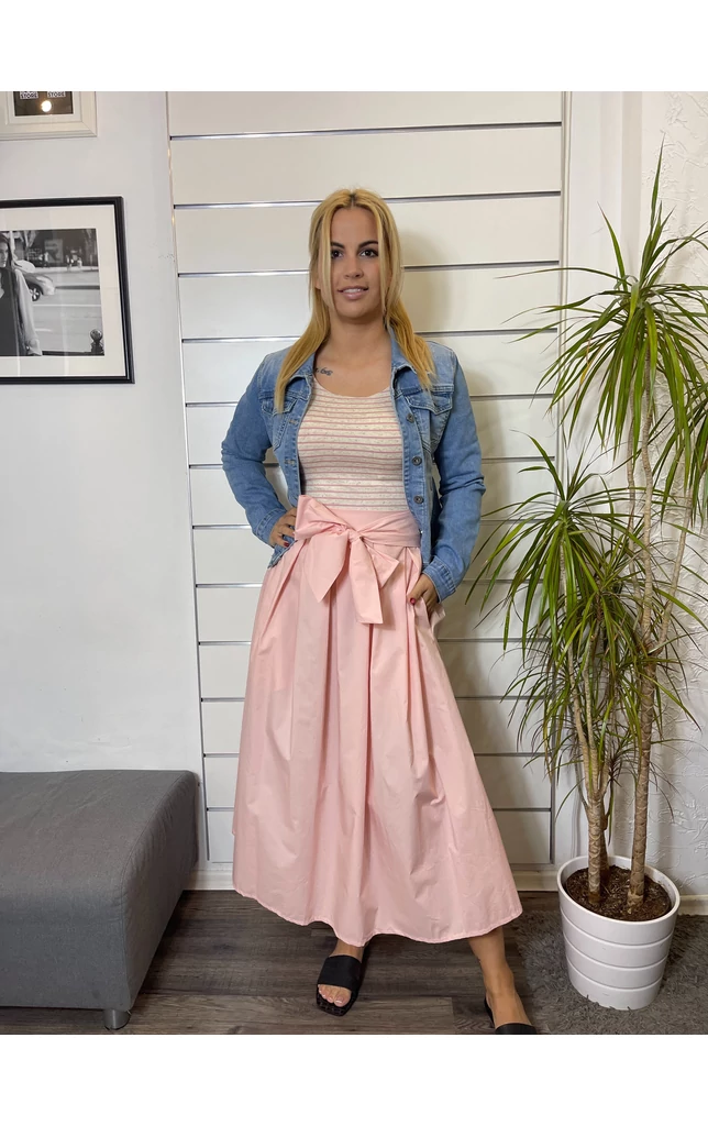 Derékrészben hátul gumírozott. Anyagösszetétel: 100% pamut Derékbőség 34-50 cm, teljes hossza 84 cm. A modell 170 cm magas.