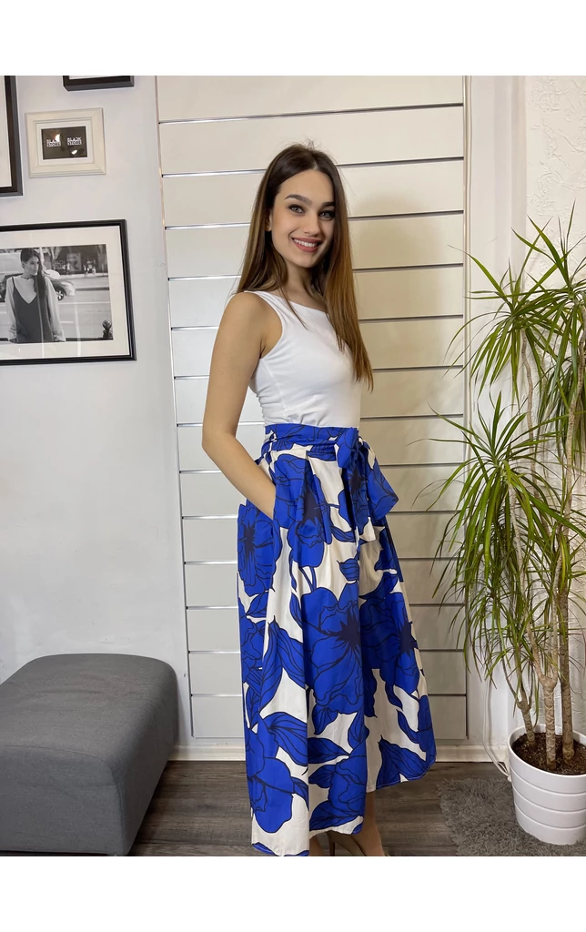 Derékrész hátul gumirozott. Anyagösszetétel: 100% pamut Derékbőség 34-50 cm, teljes hossza 86 cm. A modell 170 cm magas.
