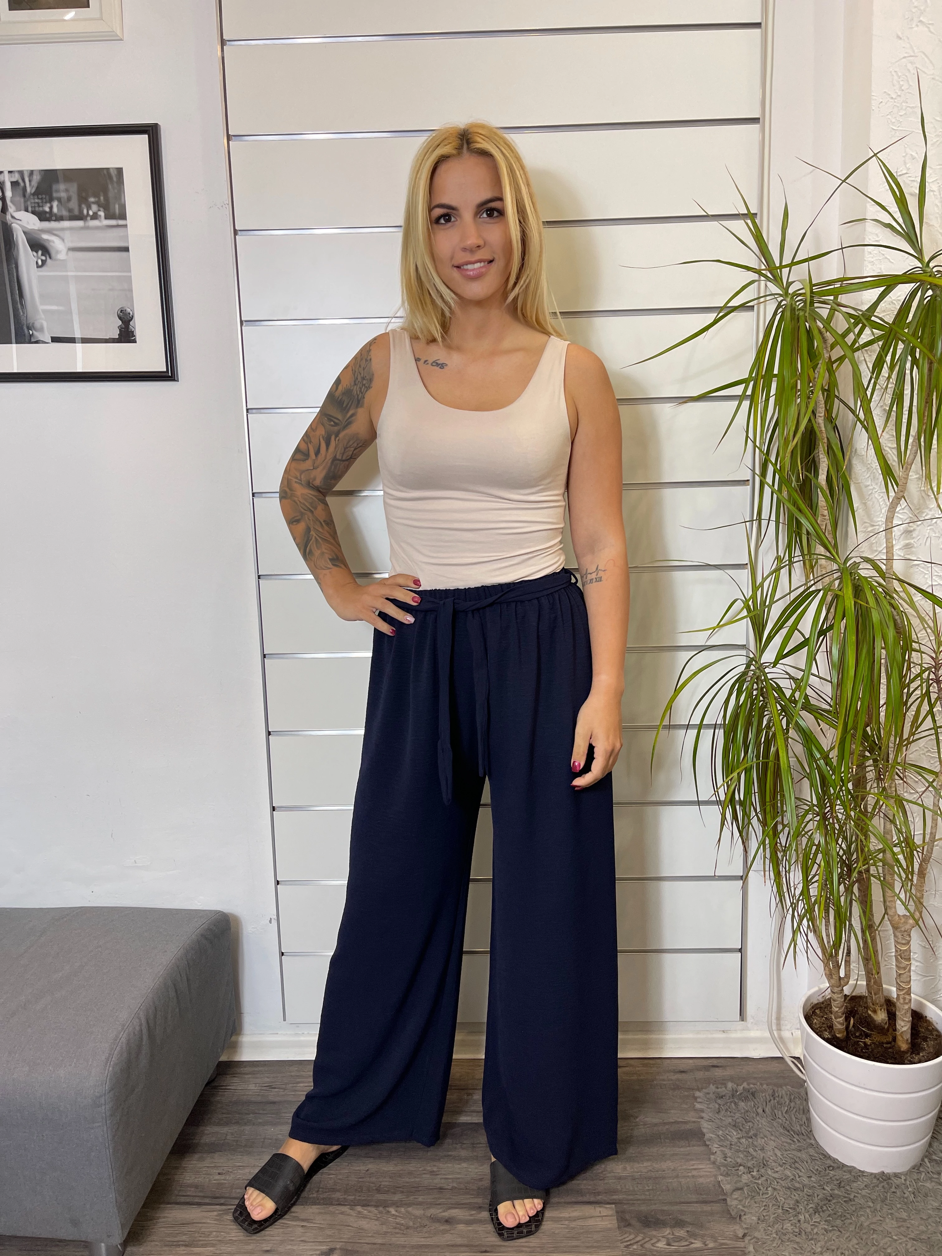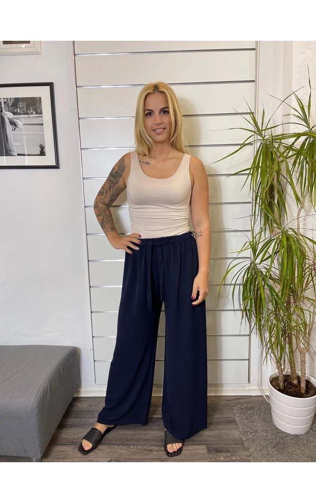 Gumis derekú, lenge, bőszárú nadrág. Anyagösszetétel: 95% poliészter, 5% elasztán Derékbőség 35-60 cm, teljes hossza 100 cm. A modell 170 cm magas.